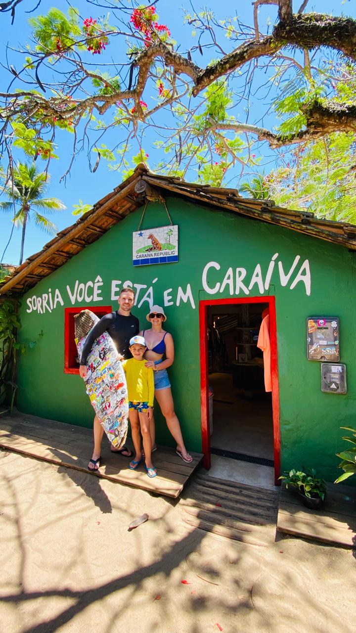 Por lá você conhecerá a famosa casinha verde "Sorria, você está em Caraíva" e o belíssimo encontro do rio com o mar.